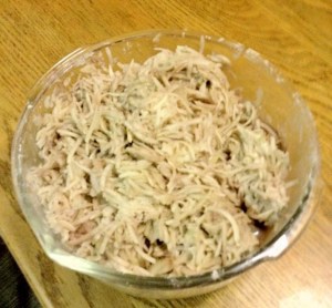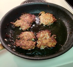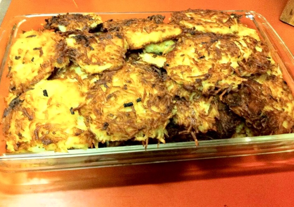 Take a lot of potatoes and some onions; shred them in the food processor. Mix them with a couple of eggs, some flour, some salt, in no particular order.