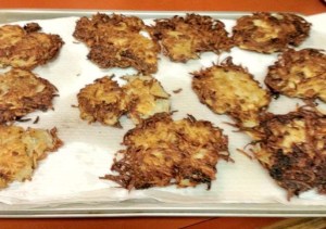 A: Because of copyright restrictions, I cannot copy and paste latke recipes from cookbooks. But you can check Chef Google for a recipe – there are 45,000 sites listed for “potato latke recipes” there.